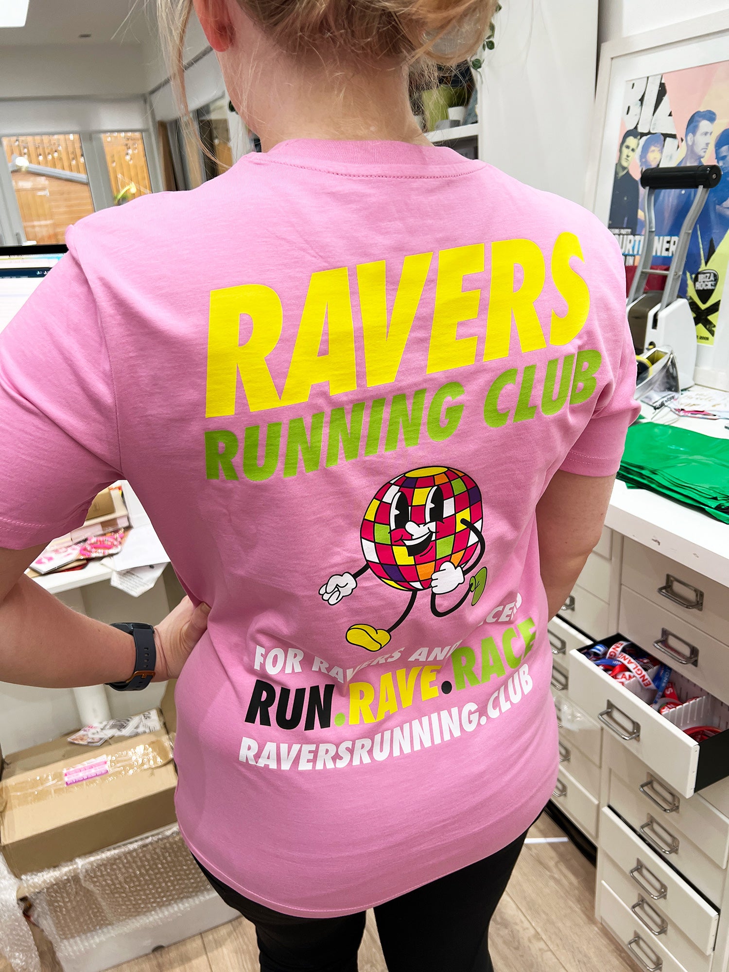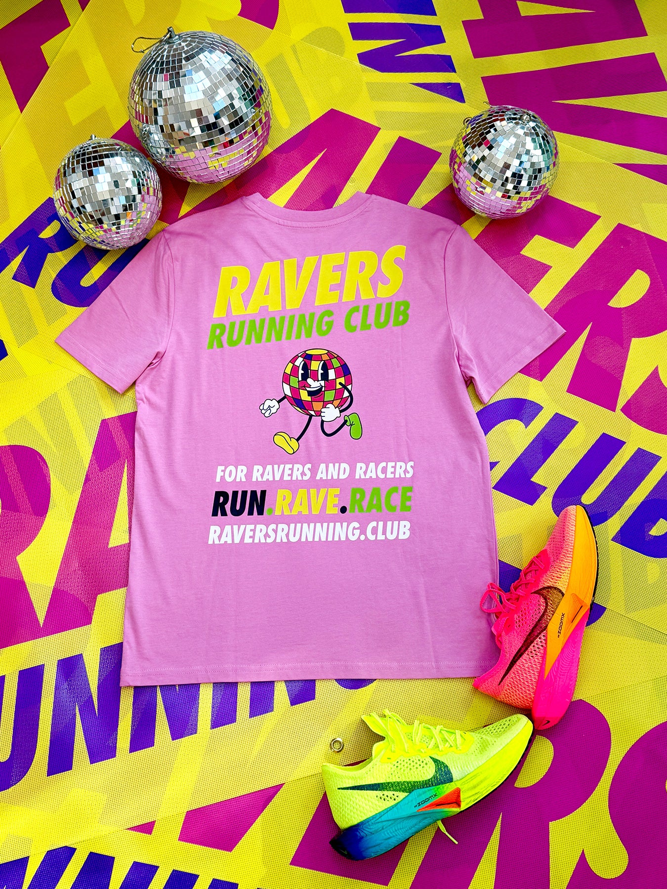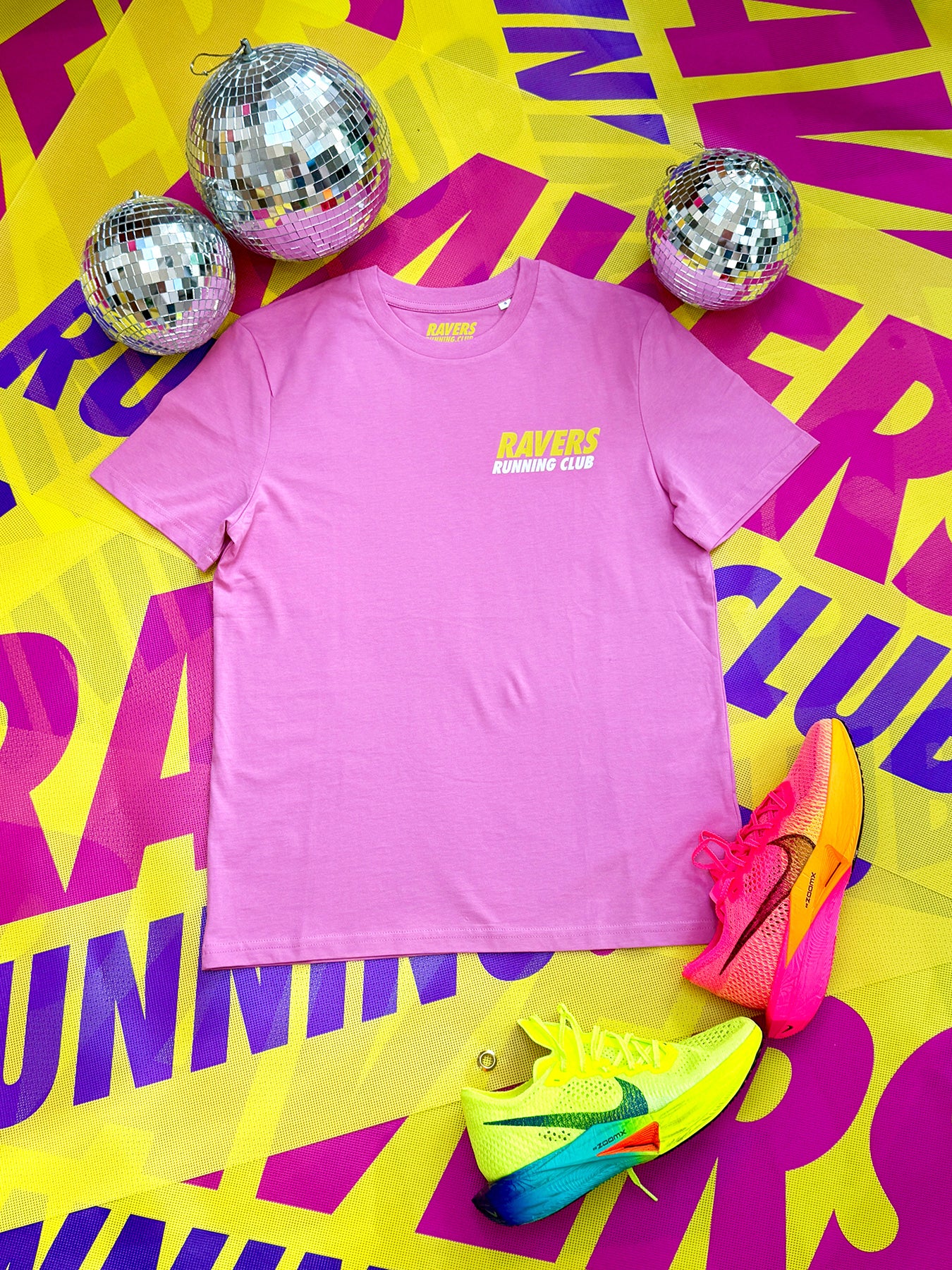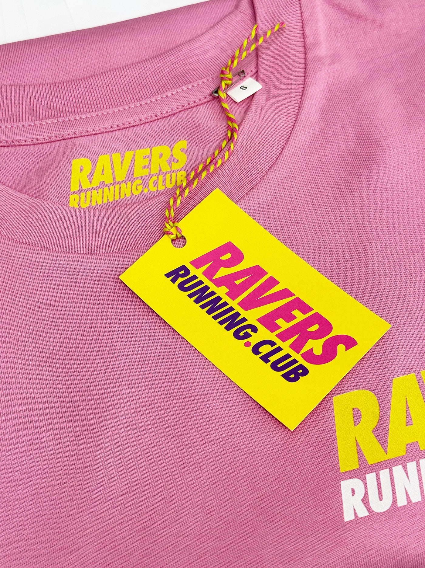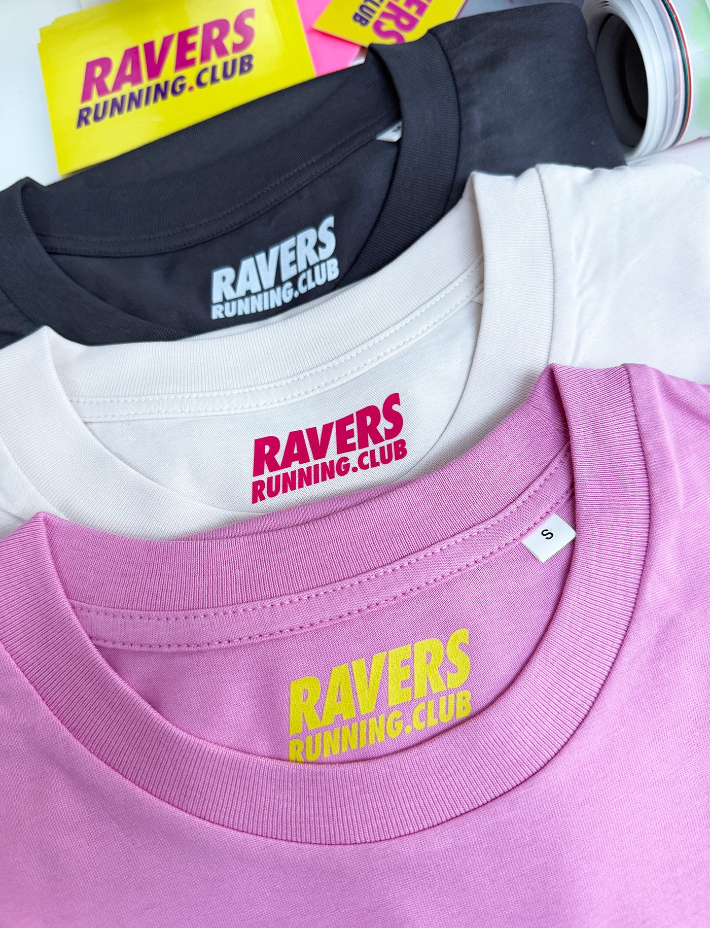 With a small Ravers Running Club logo on the front left chest and a bold, oversized print on the back, this unisex tee combines rave-ready style with playful colour – perfect for making memories in vibrant style.