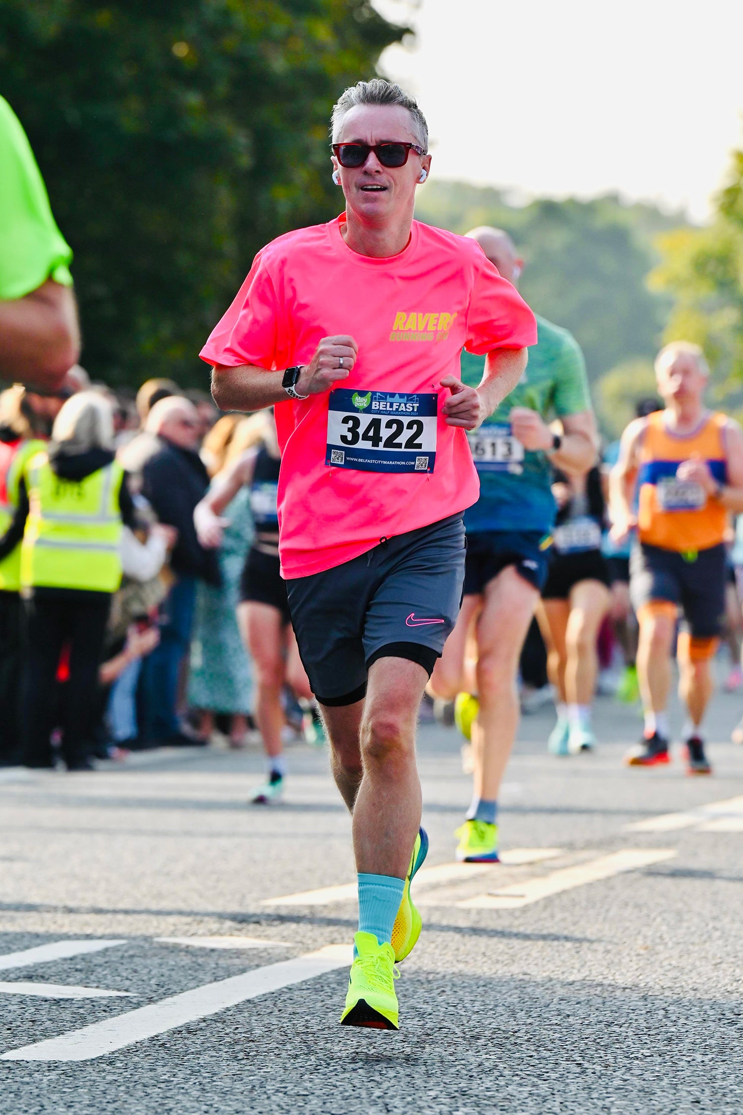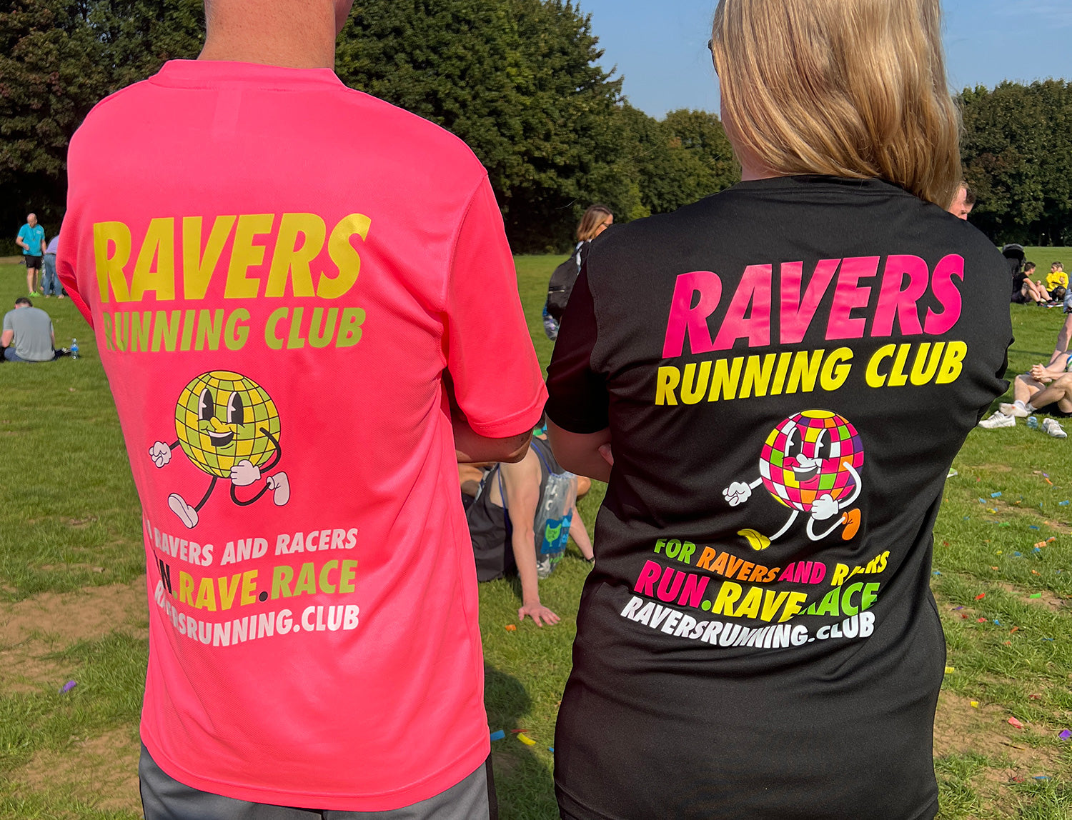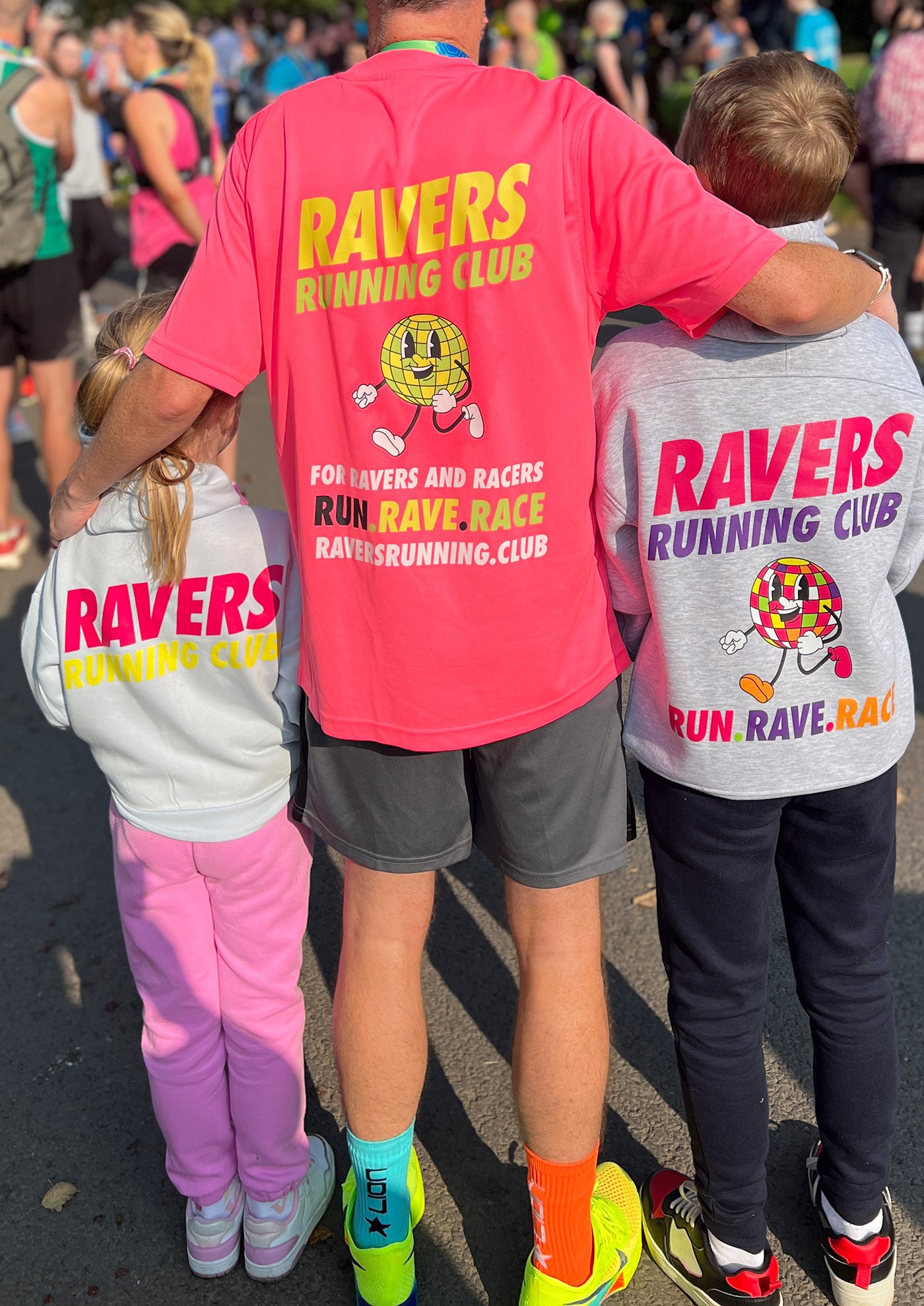 Made from quick-drying, breathable fabric, this sports t-shirt keeps you cool and energized, no matter how hard you push yourself. Available in unisex and ladies' fits, it features a sleek Ravers Running Club logo on the front and a bold, oversized print on the back that embodies the spirit of raving and racing.
