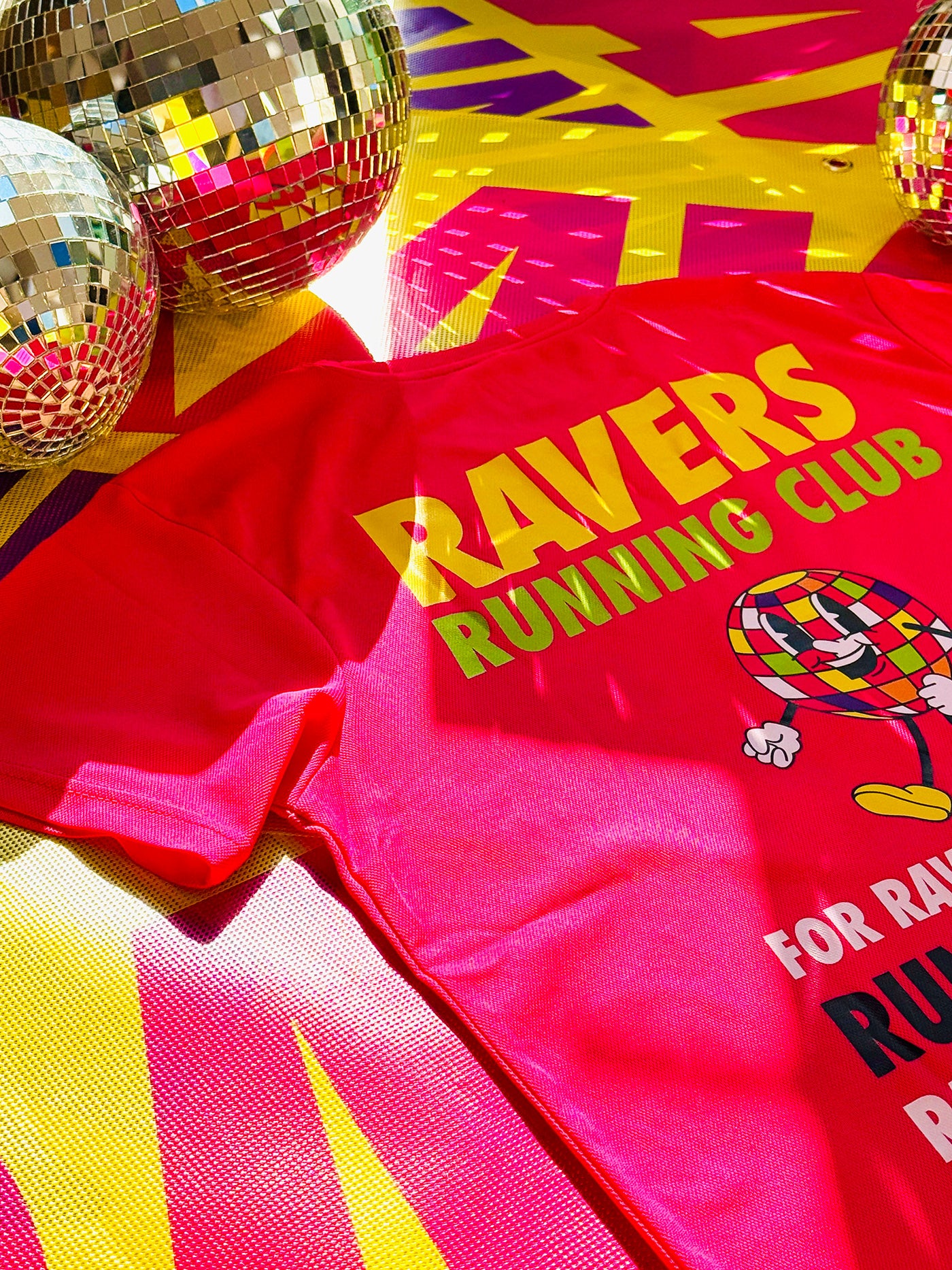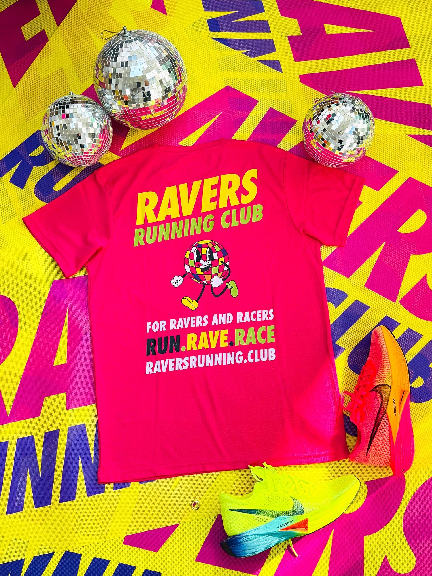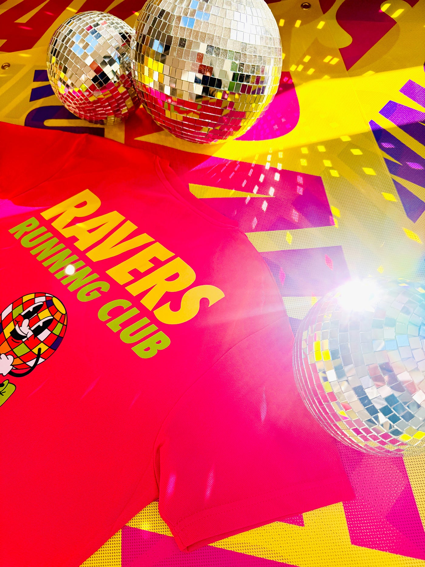 Crafted from quick-drying, high-performance fabric, this t-shirt keeps you feeling fresh and energized. The front features the iconic Ravers Running Club logo, while the back showcases Rave Runner—a playful, energetic running disco ball character—alongside the slogan RUN. RAVE. RACE, perfectly capturing the spirit of ravers and racers alike.