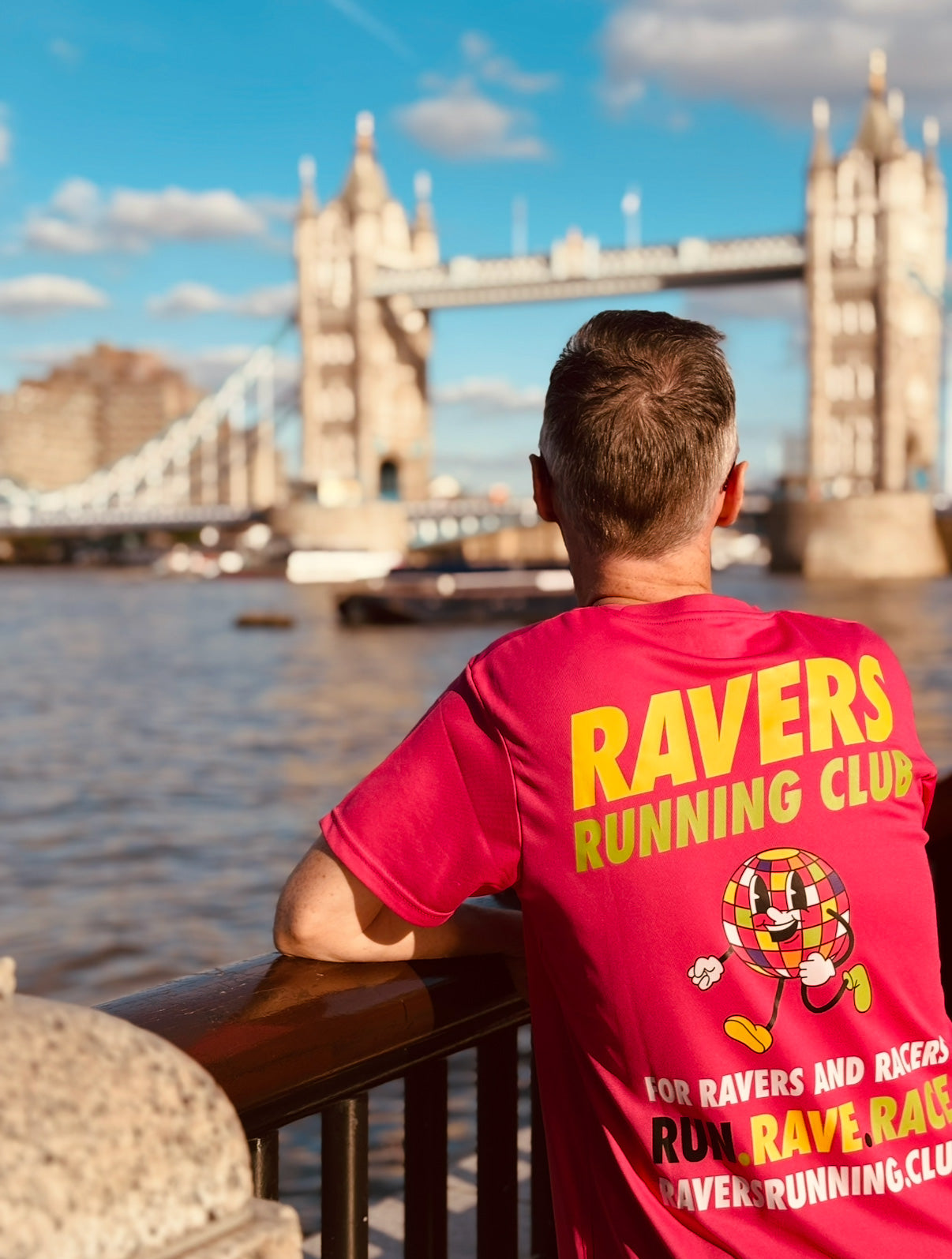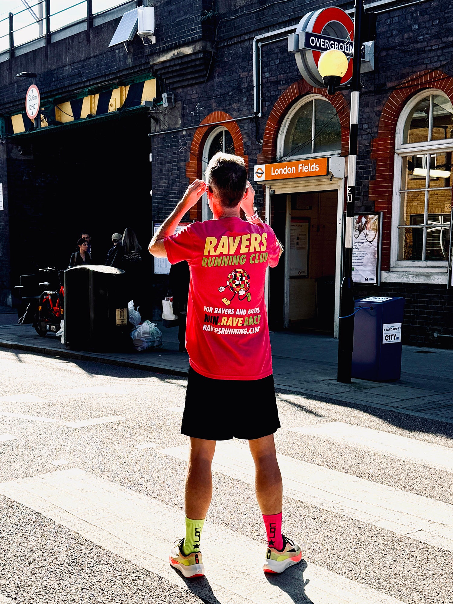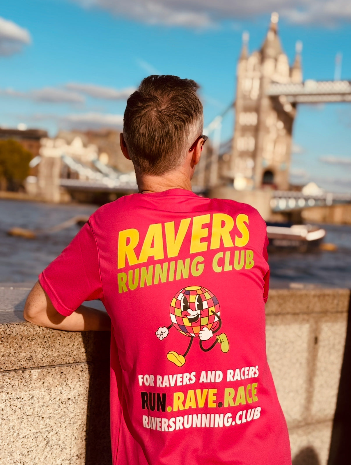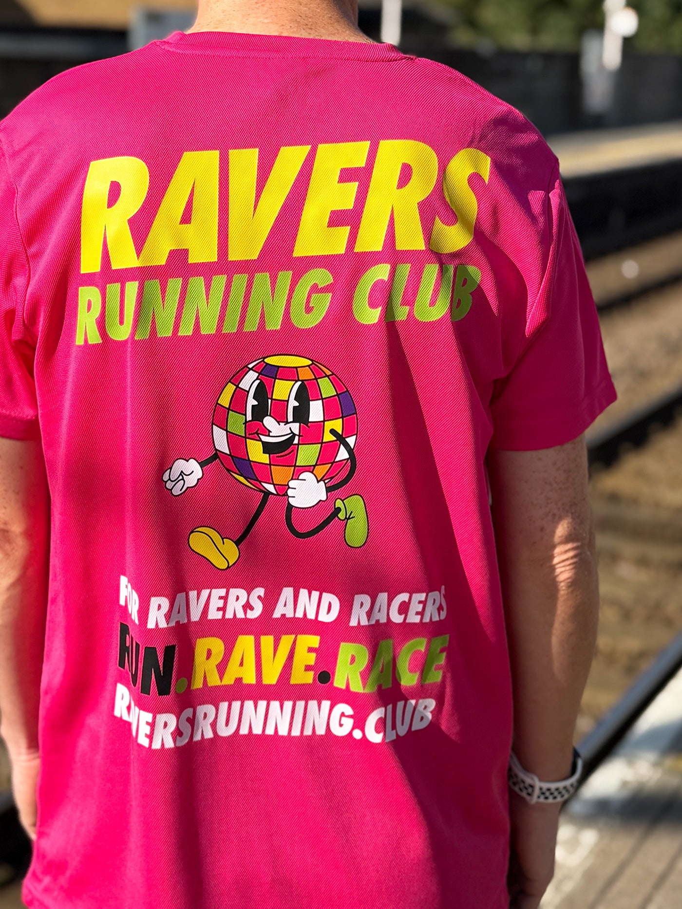 Crafted from quick-drying, high-performance fabric, this t-shirt keeps you feeling fresh and energized. The front features the iconic Ravers Running Club logo, while the back showcases Rave Runner—a playful, energetic running disco ball character—alongside the slogan RUN. RAVE. RACE, perfectly capturing the spirit of ravers and racers alike.