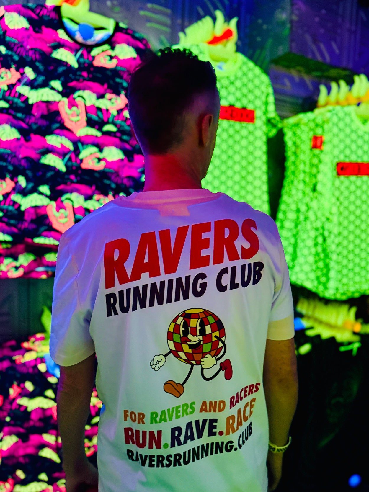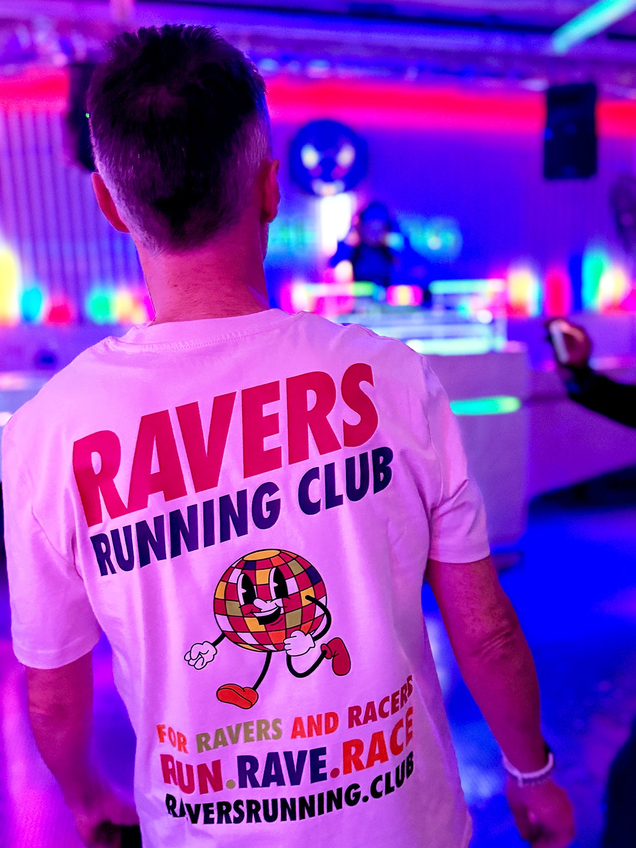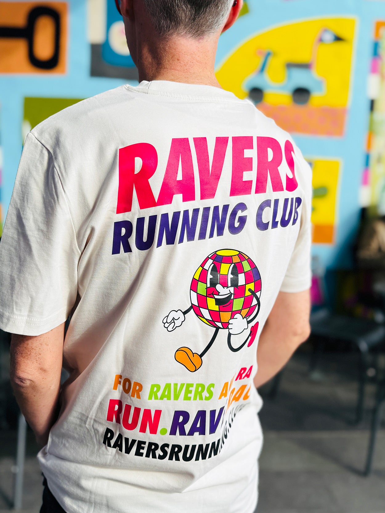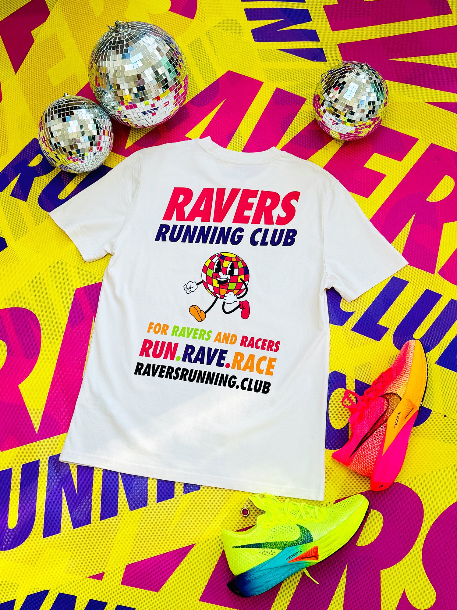 This Vintage White unisex tee features our iconic Ravers Running Club logo on the front left chest and a bold, oversized print on the back, featuring our running disco ball character RAVE RUNNER bursting with energy, accompanied by the slogan RUN. RAVE. RACE—perfect for ravers and racers alike, and perfect for standing out in any crowd.