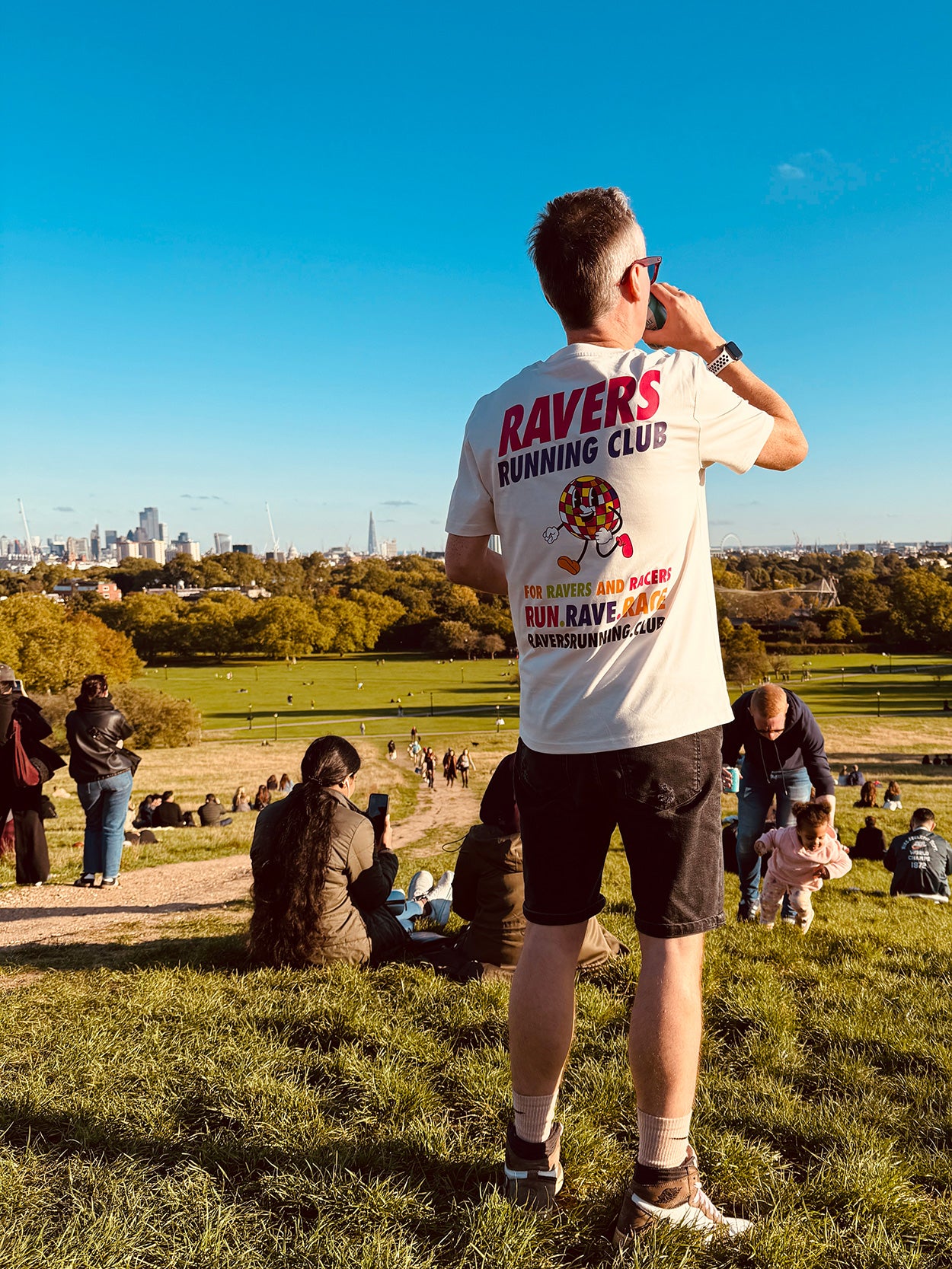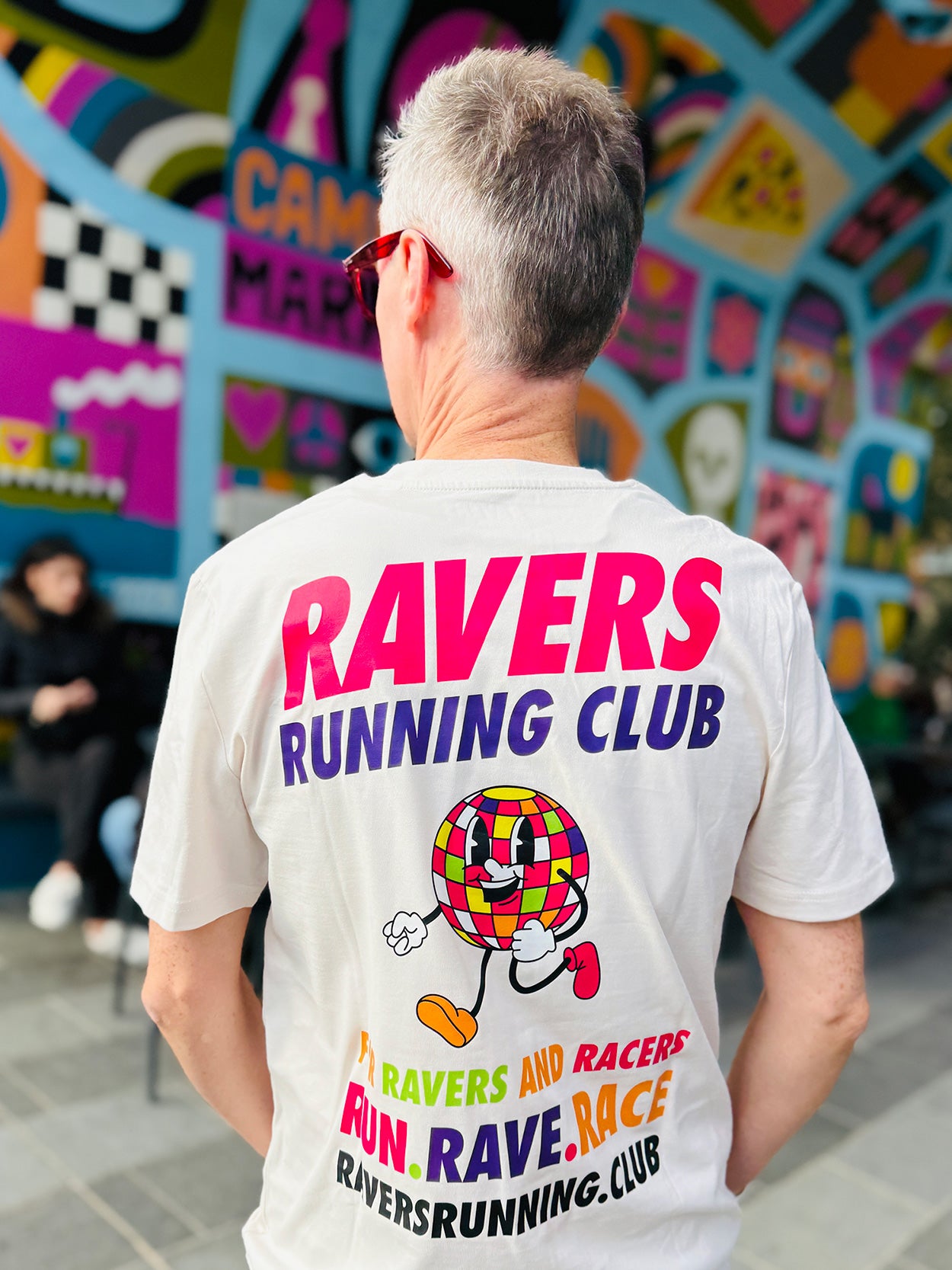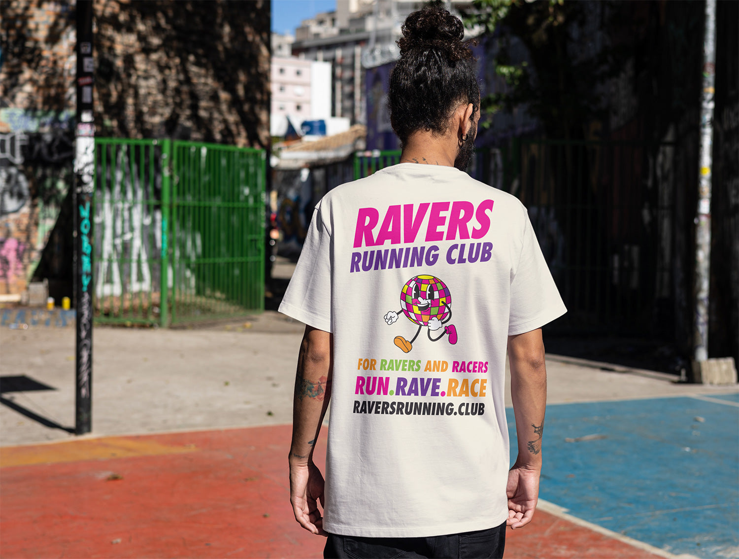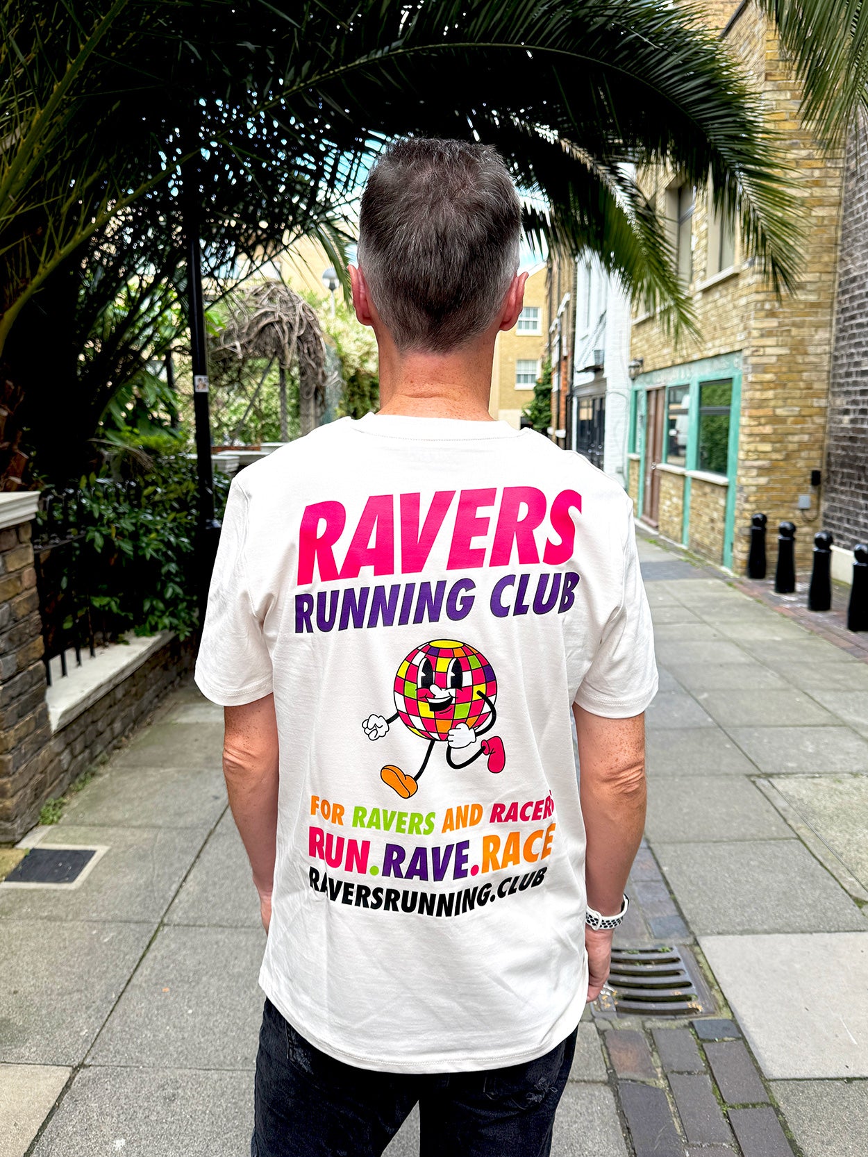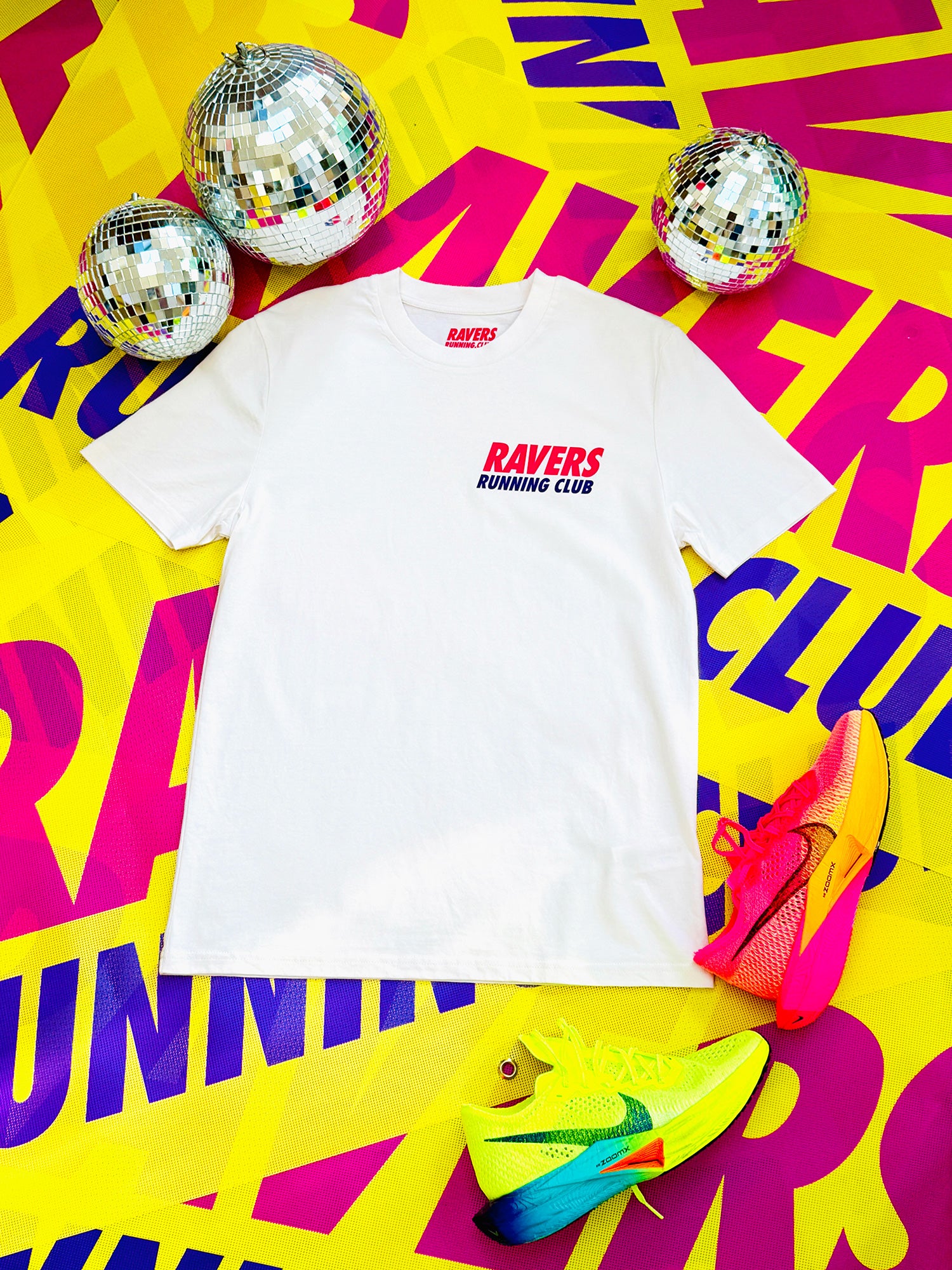 This Vintage White unisex tee features our iconic Ravers Running Club logo on the front left chest and a bold, oversized print on the back, featuring our running disco ball character RAVE RUNNER bursting with energy, accompanied by the slogan RUN. RAVE. RACE—perfect for ravers and racers alike, and perfect for standing out in any crowd.