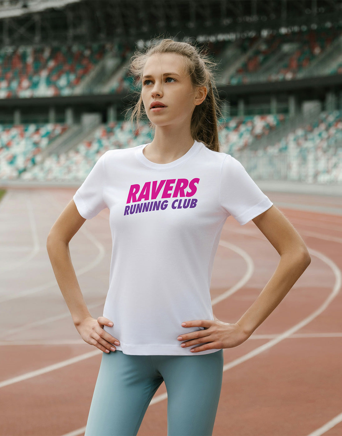 Simple, bold, and ready for action! The Ravers Running Club Sports T-Shirt features a standout, oversized RAVERS RUNNING CLUB logo on the front chest, making a strong impression whether you’re hitting the gym, going for a run, or just kicking back in sporty style. No print on the back of these Tee's - Front logo only.